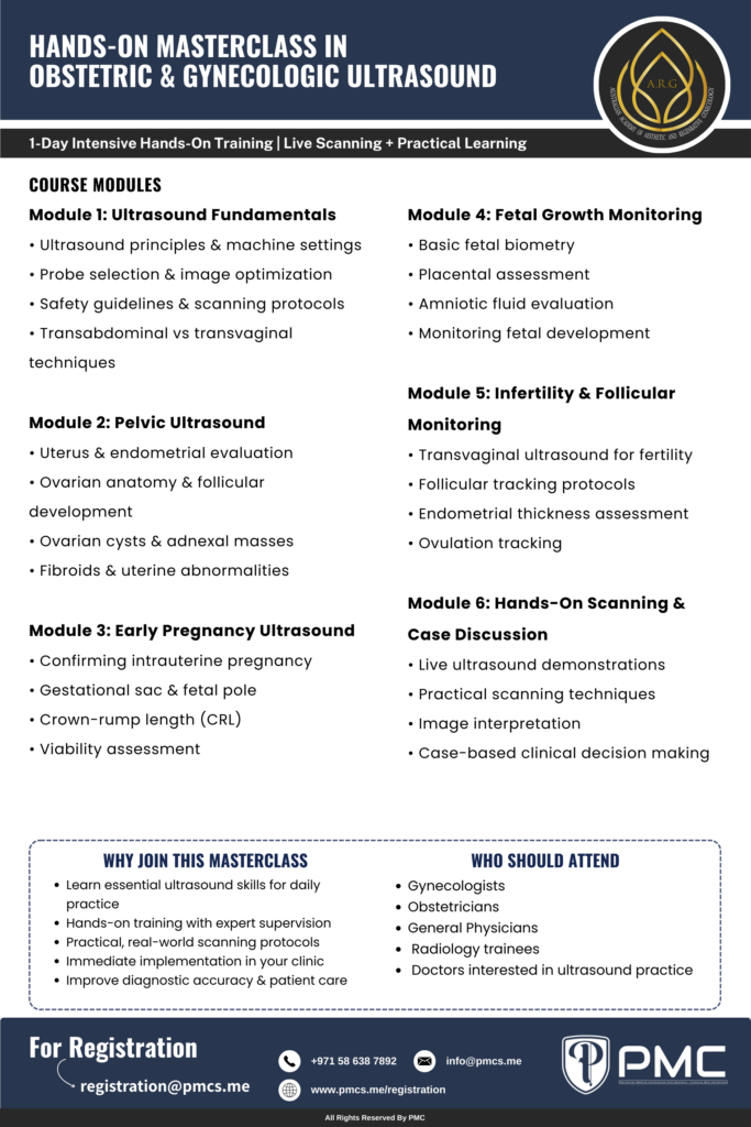 The Hands-On Masterclass in Obstetric & Gynecologic Ultrasound is an intensive 1-day practical training program designed for healthcare professionals who wish to enhance their diagnostic skills in ultrasound imaging for obstetrics and gynecology.