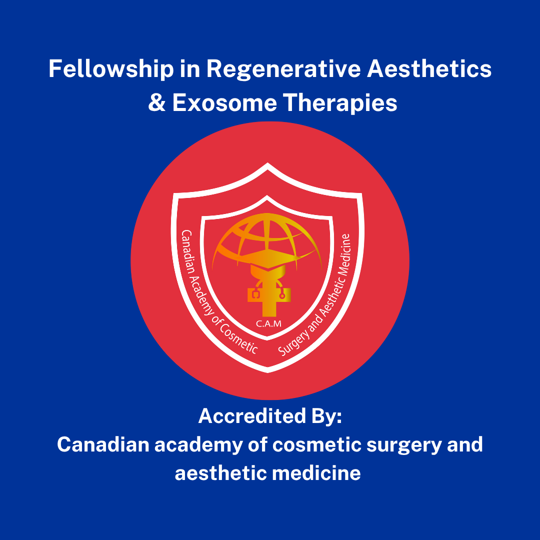 International Fellowship Certificate in Regenerative Aesthetics & Exosome Therapies accredited from Canadian academy of cosmetic surgery and aesthetic medicine.